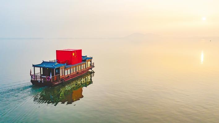 9月28日上午,在武汉的隆胡门(Wuhan)的林博门(Lingbo Gate),是十多艘帆船,游轮等的舰队,由一艘带有大国旗的邮轮领导,驶向黎明。 (He Yuxin,Hubei Daily All Media Reporter,通讯员Gao Mengya的照片)