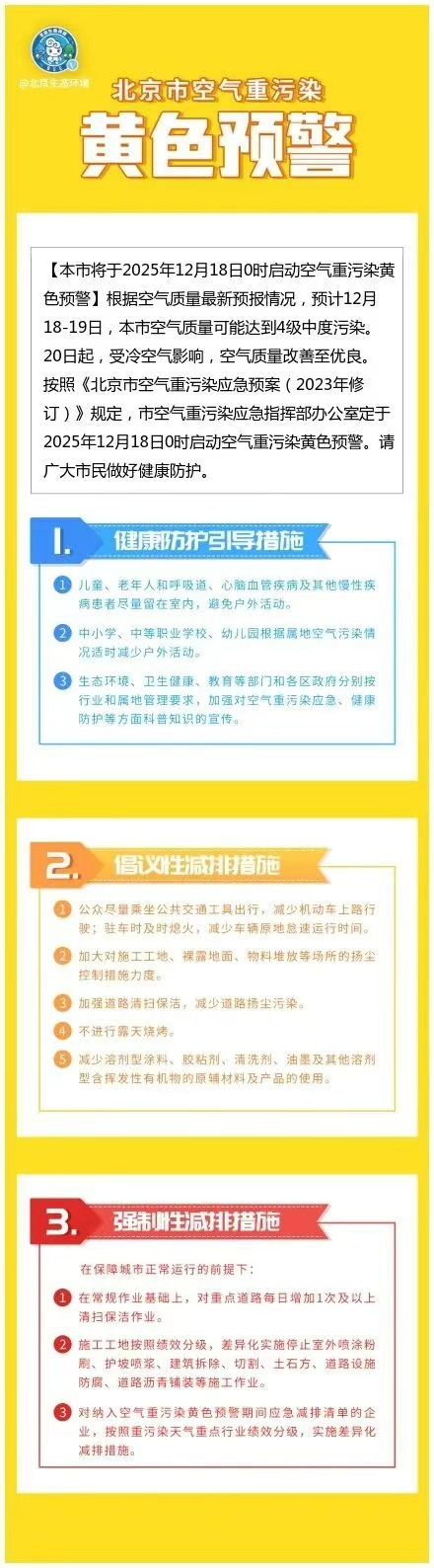 根据最新空气质量预报,预计12月18日至19日,北京空气质量可能达到四级中度污染。 20日以来,受冷空气影响,空气质量转为优。 根据《北京市大气重污染应急预案(2023年修订)》,北京市大气重污染应急指挥部定于2025年12月18日零时发布大气重污染黄色预警,请广大群众做好健康防护。